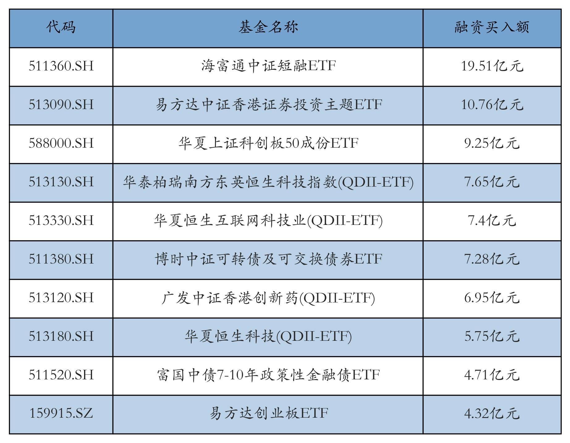 9月15日ETF融资买入额前三位分别为:海富通中证短融ETF(19.51亿元)、易方达中证香港证券投资主题ETF(10.76亿元)和华夏上证科创板50成份ETF(9.25亿元),前10具体见下表: