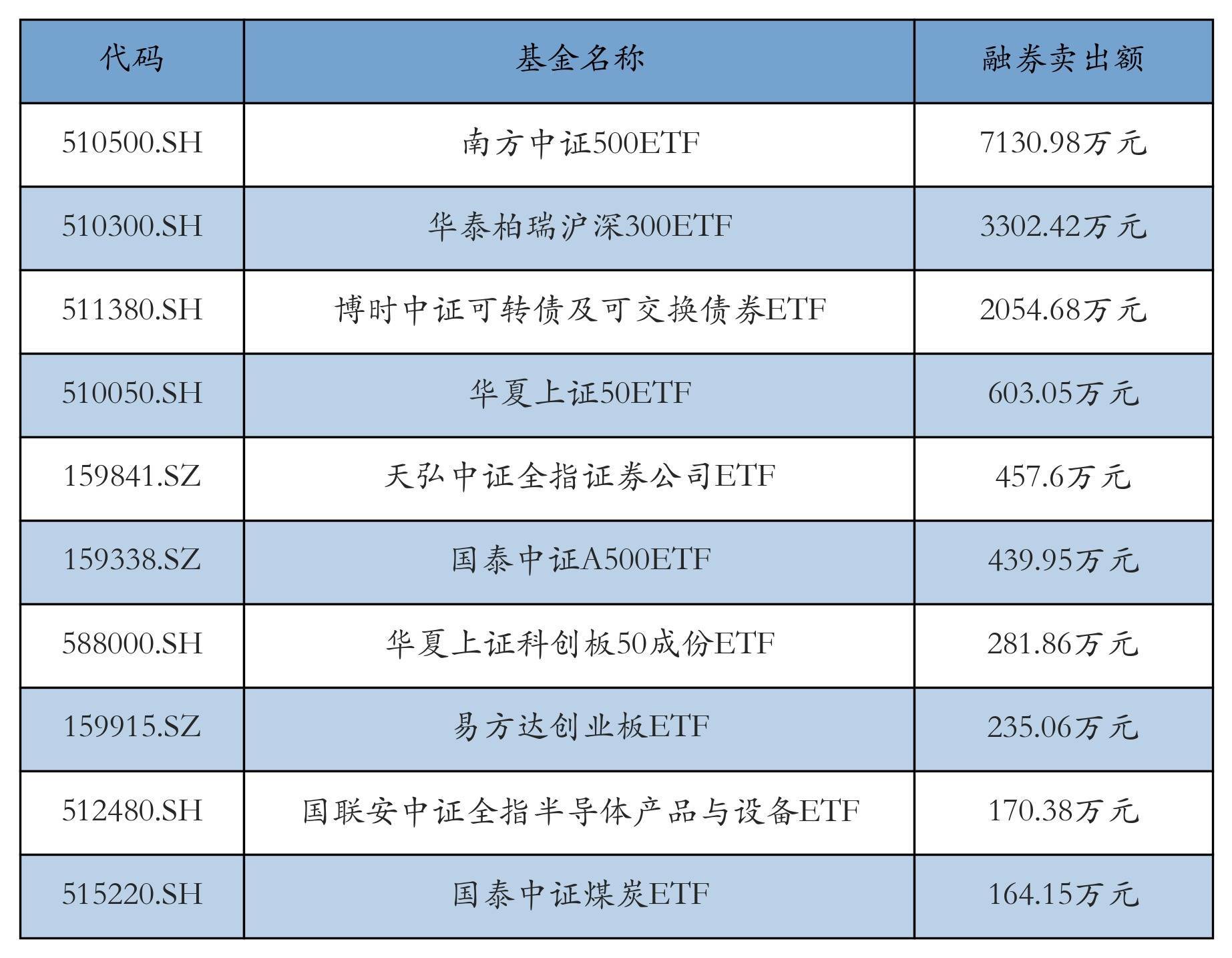9月15日ETF融券卖出额前三位分别为:南方中证500ETF(7130.98万元)、华泰柏瑞沪深300ETF(3302.42万元)和博时中证可转债及可交换债券ETF(2054.68万元),前10具体见下表: