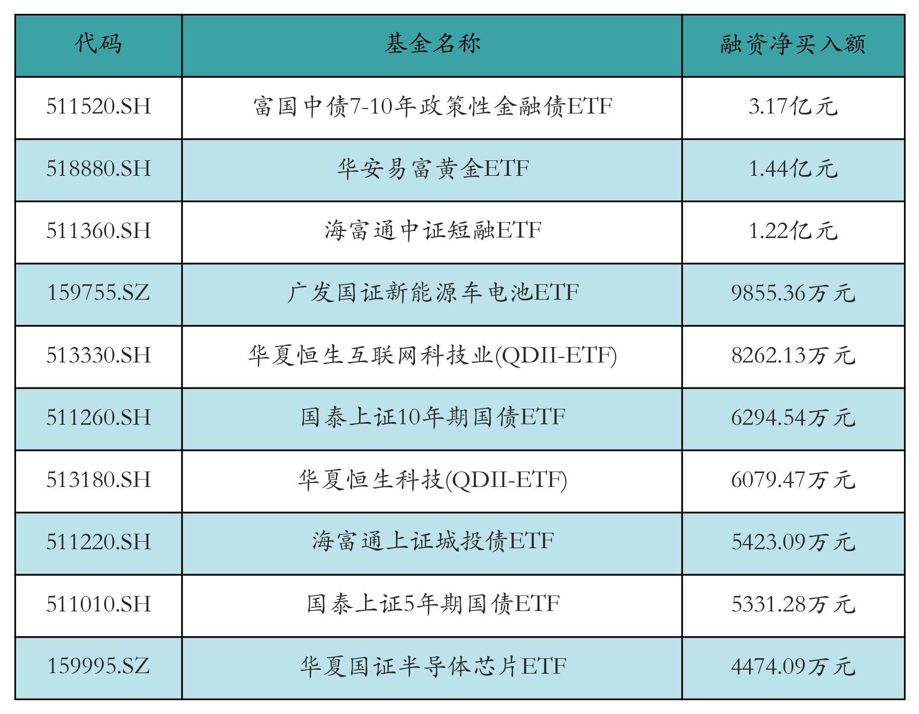 9月15日ETF融资净买入额前三位分别为:富国中债7-10年政策性金融债ETF(3.17亿元)、华安易富黄金ETF(1.44亿元)和海富通中证短融ETF(1.22亿元),前10具体见下表: