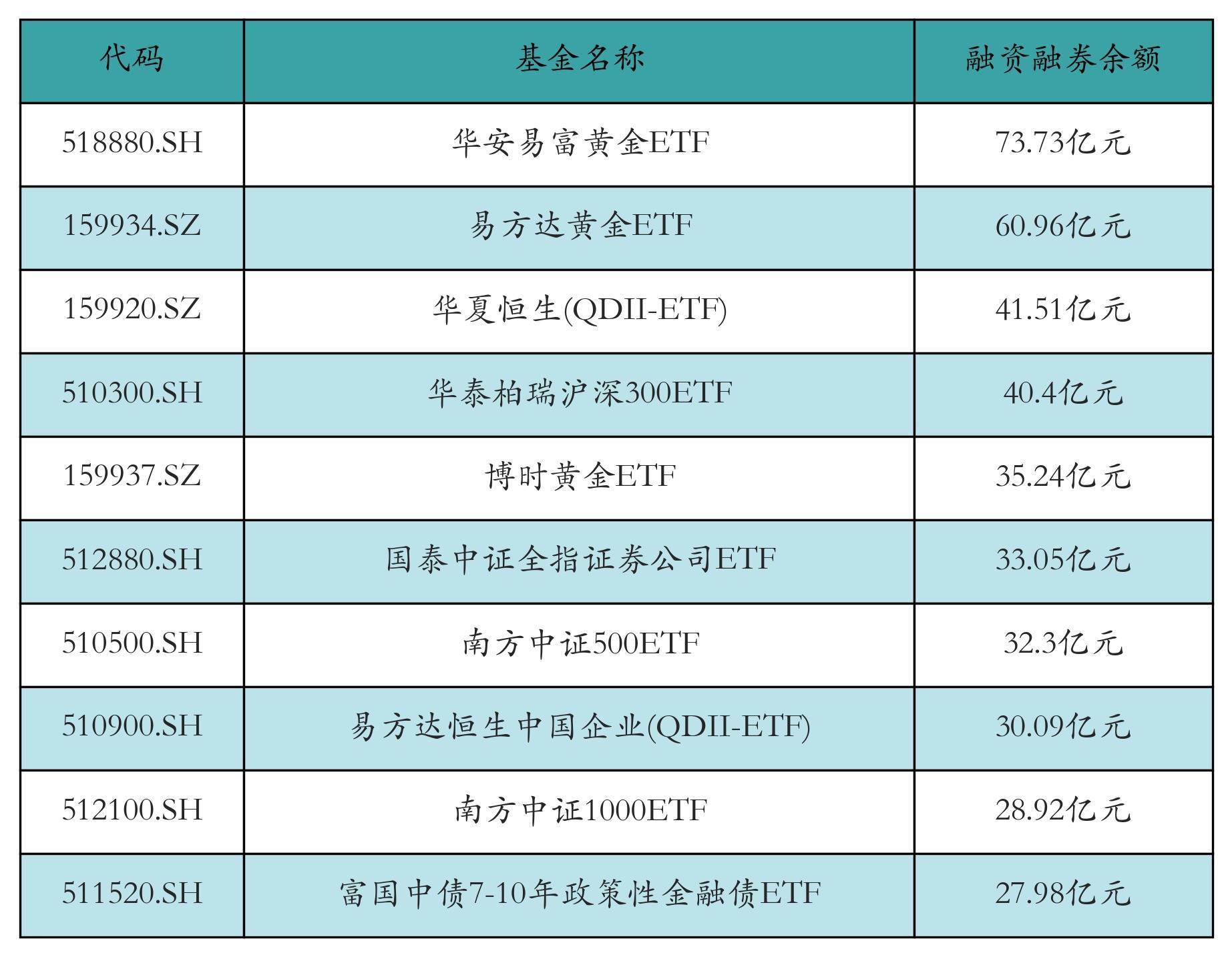 9月15日ETF两融余额前三位分别为:华安易富黄金ETF(73.73亿元)、易方达黄金ETF(60.96亿元)和华夏恒生(QDII-ETF)(41.51亿元),前10具体见下表: