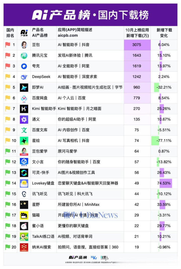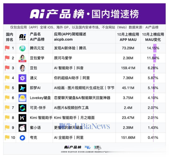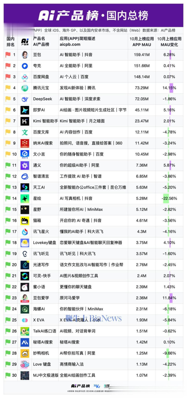 最新公布的《AI产品榜·国内总榜、增速榜、下载榜》显示股票配资程序,10月国内AI应用格局出现明显变化: