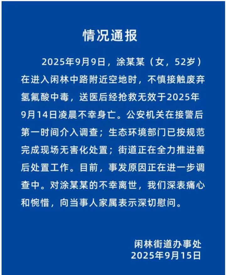 2025年9月9日,涂某某(女,52岁)在进入闲林中路附近空地时,不慎接触废弃氢氟酸中毒,送医后经抢救无效于2025年9月14日凌晨不幸身亡。